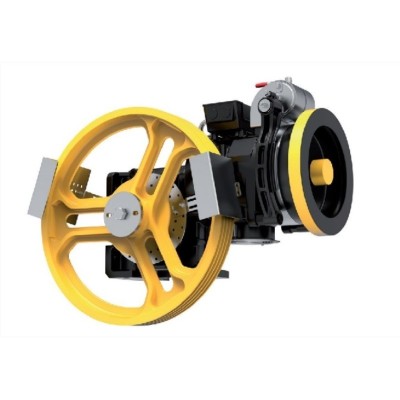 Rapporto di riduzione 65/1 - PULEGGIA DI TRAZIONE Ø 550 mm ; 4 x ø10 ; Tipo gole Y ; Angolo V 35 ° Angolo sottointaglio 105 ° ;Sottointaglio 7,93 mm ; Interasse gole 17 mm Azionamento VVVF ; 4 Poli ; 3,7 kWasy ( 5,4 Hp ) ; 380/220 V ; 50 Hz; 240 St/h ; Velocità  0,66m/s - tiro 1:1 - freno 60V